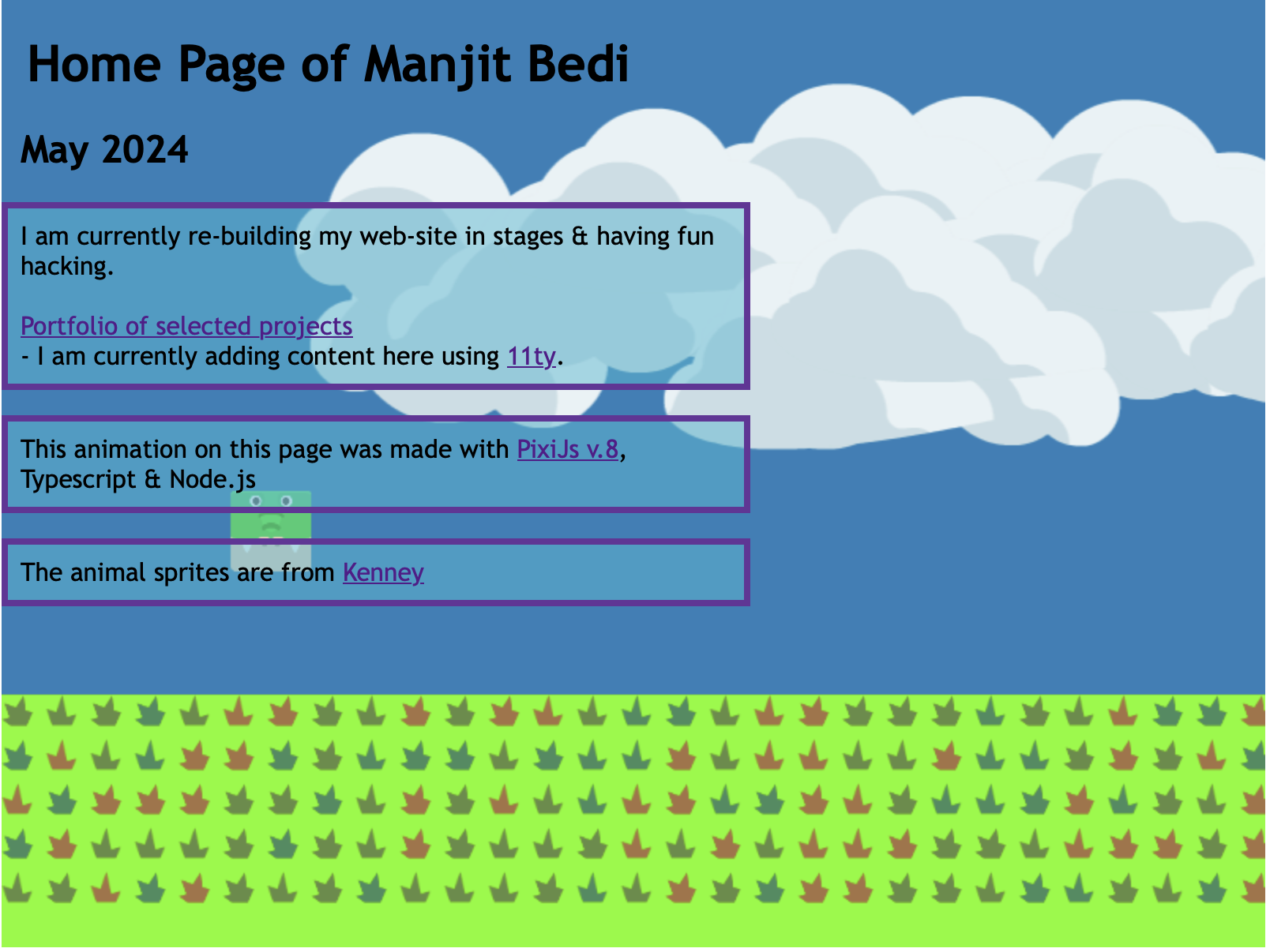 I have been hacking parts of my web-site. In May 2024, I started rebuilding the home page using PixiJS.